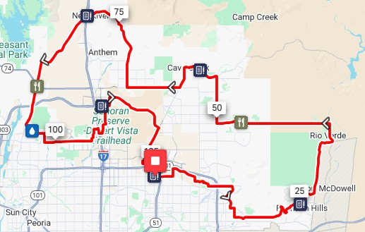 This route will explore numerous nice cycling areas in the far North Phoenix valley. The climbing will be modest and none are particularly challenging. Areas visited on the 200k include: Phoenix Sonoran Preserve, Peoria Regional Preserve, Lake Pleasant, Cave Creek and Fountain Hills. It's a scenic route with not much to slow you down.