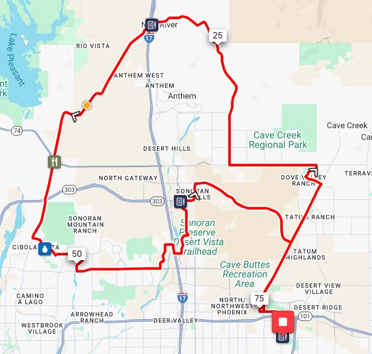 This route will explore numerous nice cycling areas in the far North Phoenix valley. The climbing will be modest and none are particularly challenging. Areas visited on the 125k include: Phoenix Sonoran Preserve, Peoria Regional Preserve, Lake Pleasant and New River. It's a scenic route with not much to slow you down.